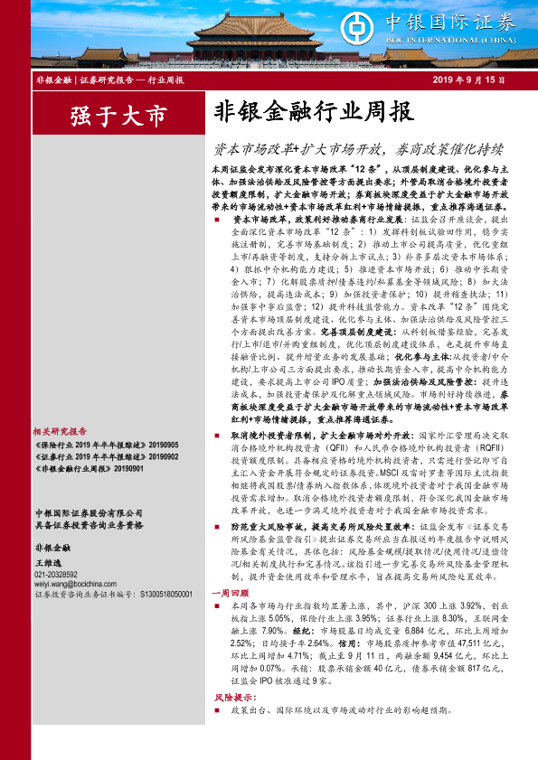 【中银证券】【20190915】非银金融行业周报:资本市场改革+扩大市场开放,券商政策催化持续-12页