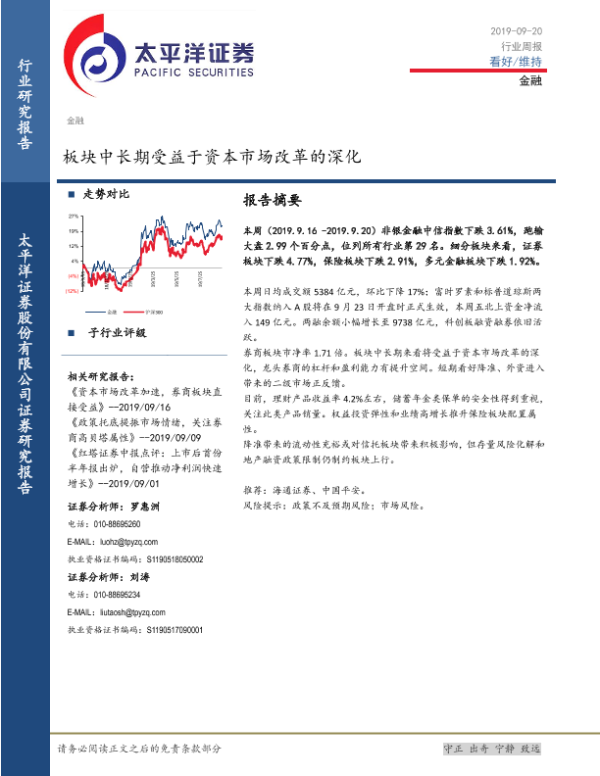 【太平洋证券】【20190920】金融行业周报:板块中长期受益于资本市场改革的深化-12页