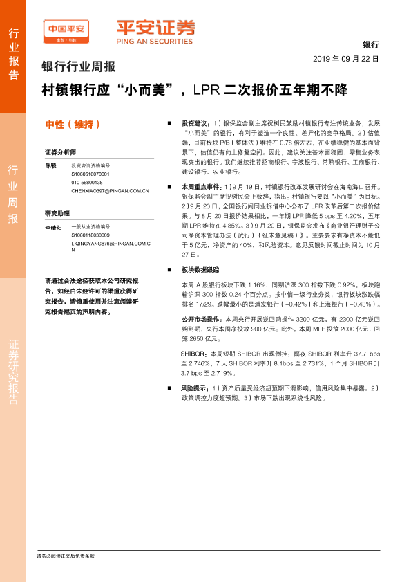 【平安证券】【20190922】银行行业周报:村镇银行应“小而美”,LPR二次报价五年期不降-4页