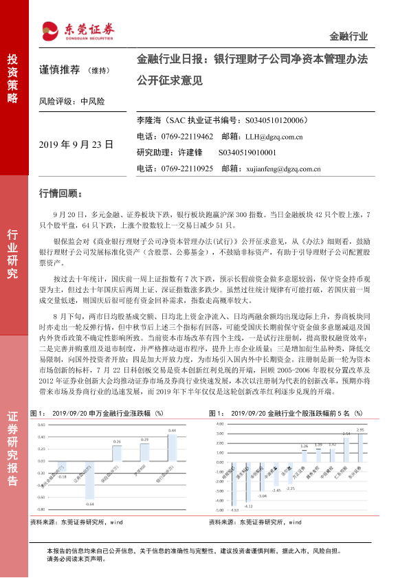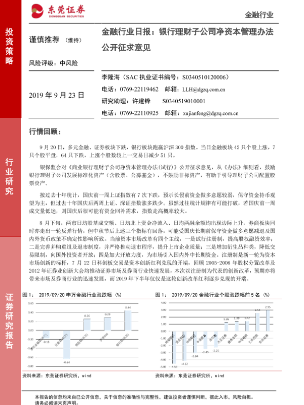 【东莞证券】【20190923】金融行业日报:银行理财子公司净资本管理办法公开征求意见-5页