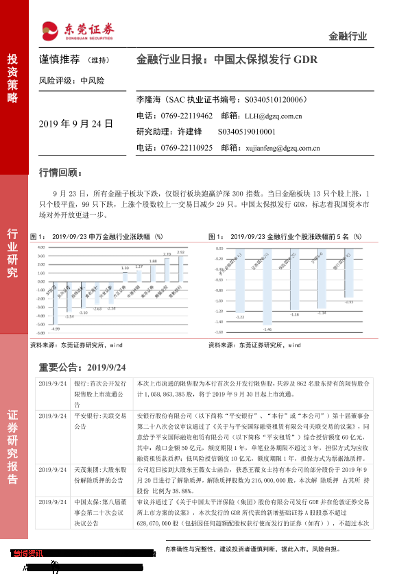 【东莞证券】【20190924】金融行业日报:中国太保拟发行GDR-4页