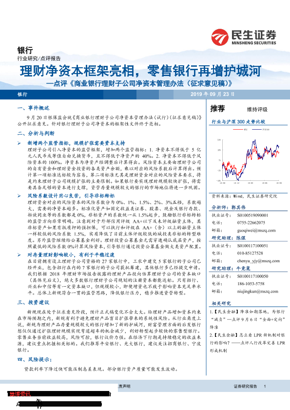 【民生证券】【20190923】点评《商业银行理财子公司净资本管理办法(征求意见稿)》:理财净资本框架亮相,零售银行再增护城河-7页