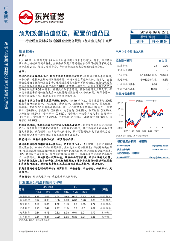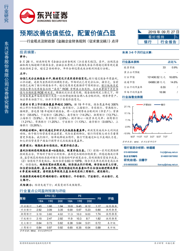 【东兴证券】【20190927】银行行业观点及财政部《金融企业财务规则(征求意见稿)》点评:预期改善估值低位,配置价值凸显-5页