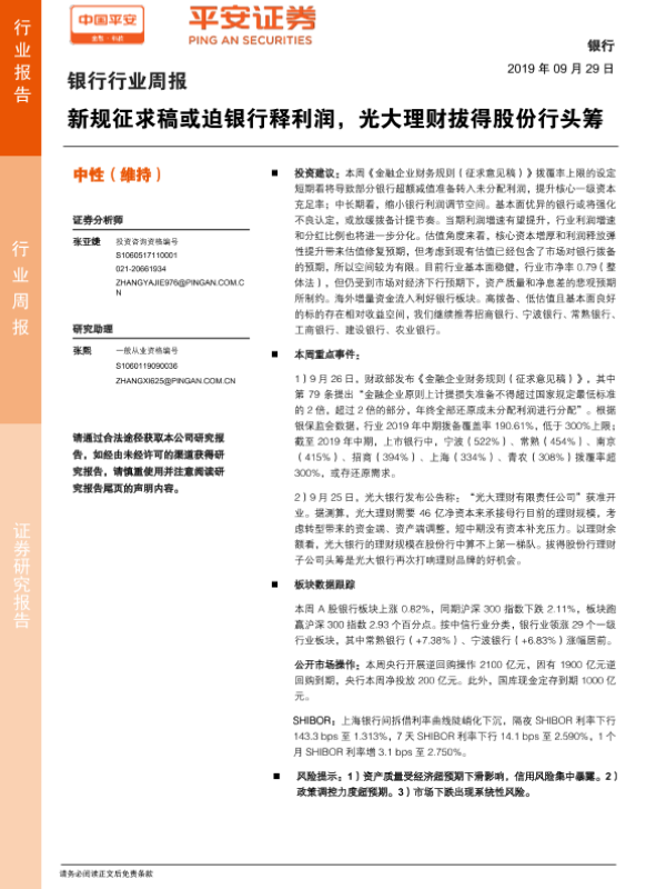 【平安证券】【20190929】银行行业周报:新规征求稿或迫银行释利润,光大理财拔得股份行头筹-4页