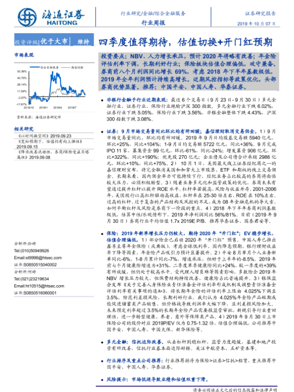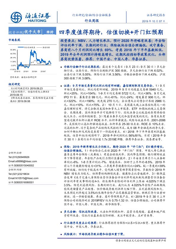 【海通证券】【20191007】综合金融服务行业周报:四季度值得期待,估值切换+开门红预期-8页