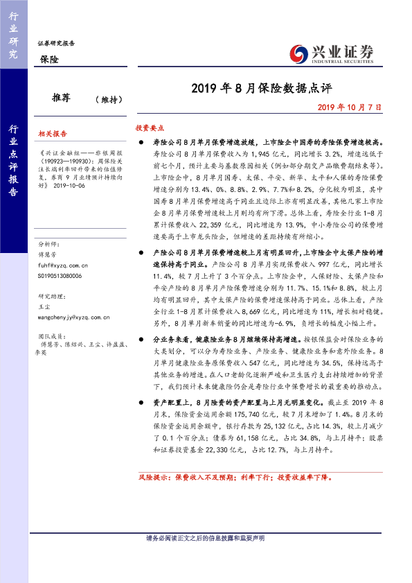 【兴业证券】【20191007】2019年8月保险数据点评-6页
