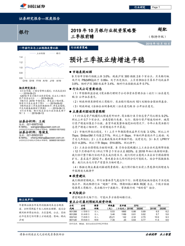 【国信证券】【20191010】2019年10月银行业投资策略暨三季报前瞻:预计三季报业绩增速平稳-9页