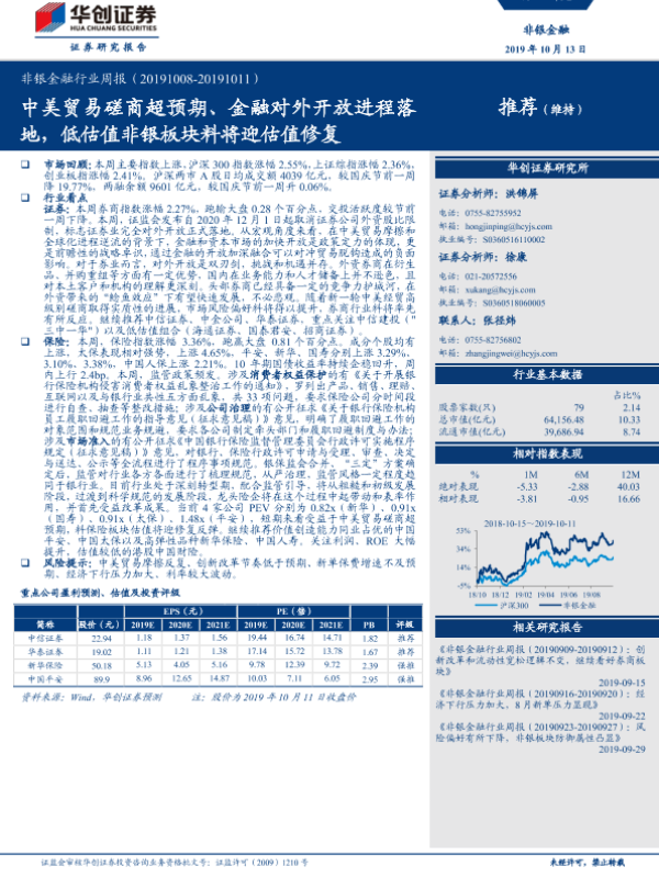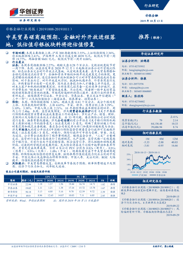 【华创证券】【20191013】非银金融行业周报:中美贸易磋商超预期、金融对外开放进程落地,低估值非银板块料将迎估值修复-20页