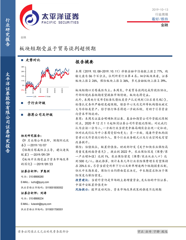 【太平洋证券】【20191013】金融行业周报:板块短期受益于贸易谈判超预期-13页