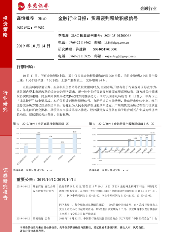【东莞证券】【20191014】金融行业日报:贸易谈判释放积极信号-5页