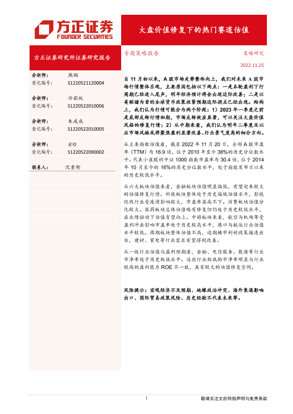 【方正证券】【20221125】大盘价值修复下的热门赛道估值-20页