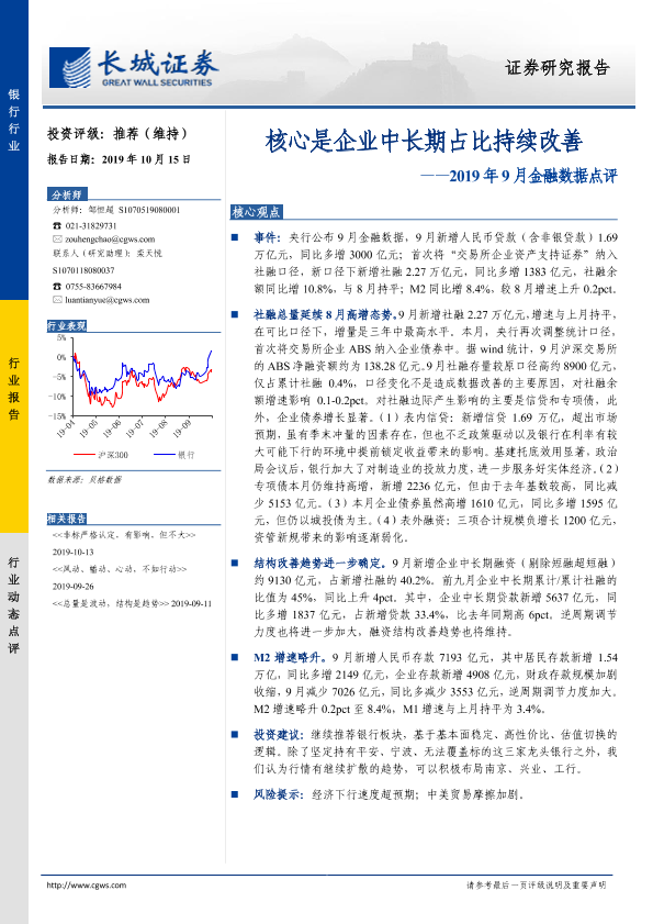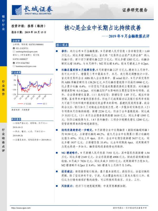 【长城证券】【20191015】银行行业2019年9月金融数据点评:核心是企业中长期占比持续改善-5页
