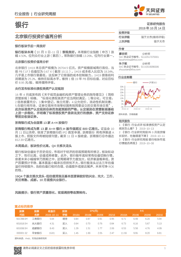 【天风证券】【20191014】银行行业研究周报:北京银行投资价值再分析-20页