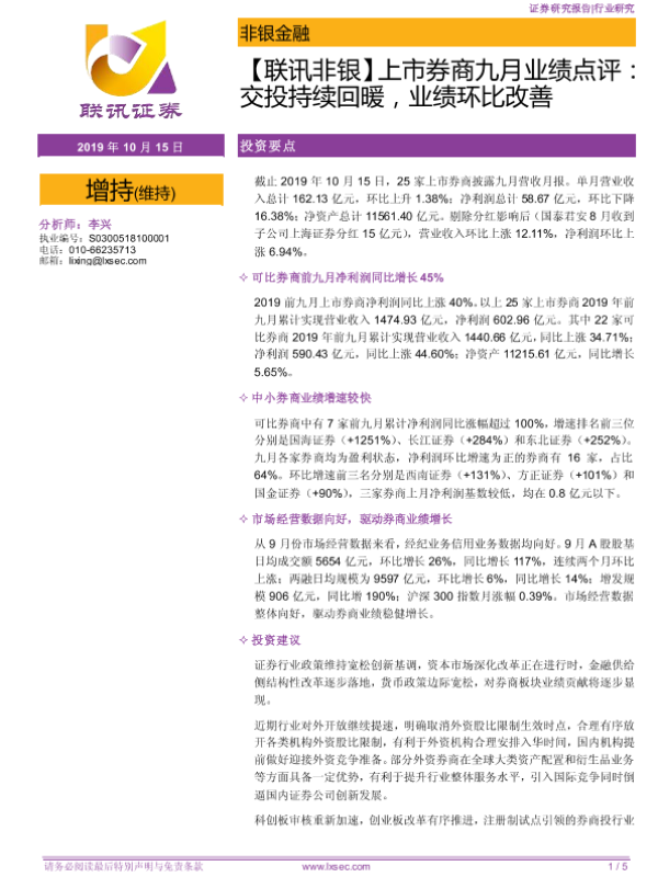 【粤开证券】【20191015】上市券商九月业绩点评:交投持续回暖,业绩环比改善-5页