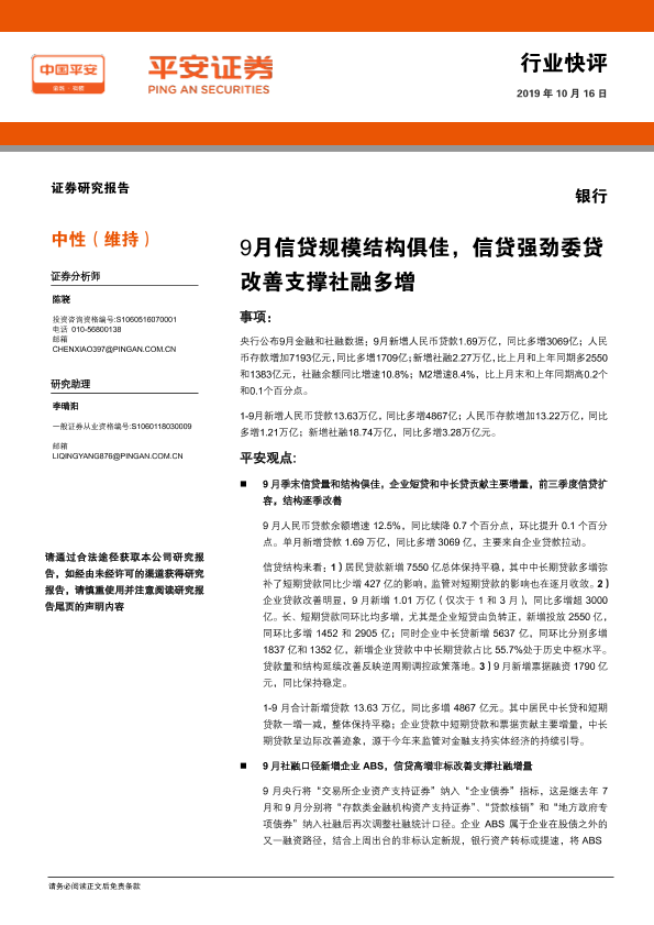 【平安证券】【20191016】9月信贷规模结构俱佳,信贷强劲委贷改善支撑社融多增-5页