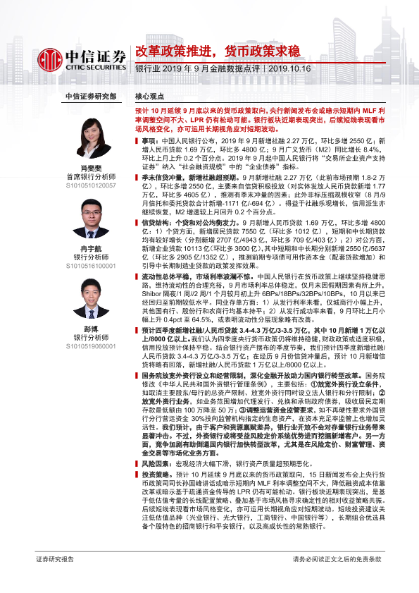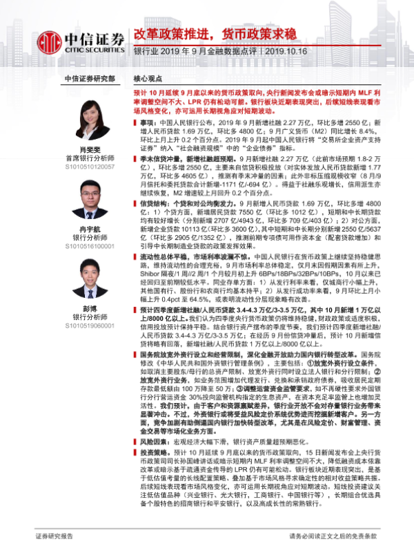 【中信证券】【20191016】银行业2019年9月金融数据点评:改革政策推进,货币政策求稳-3页