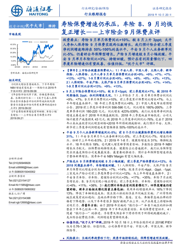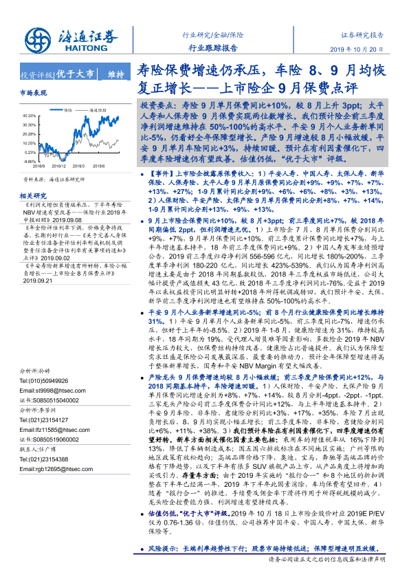 【海通证券】【20191020】上市险企9月保费点评:寿险保费增速仍承压,车险8、9月均恢复正增长-5页