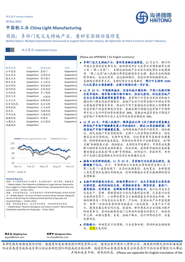 【海通国际】【20221130】中国轻工行业周报:多部门发文支持地产业,看好家居链估值修复-20页