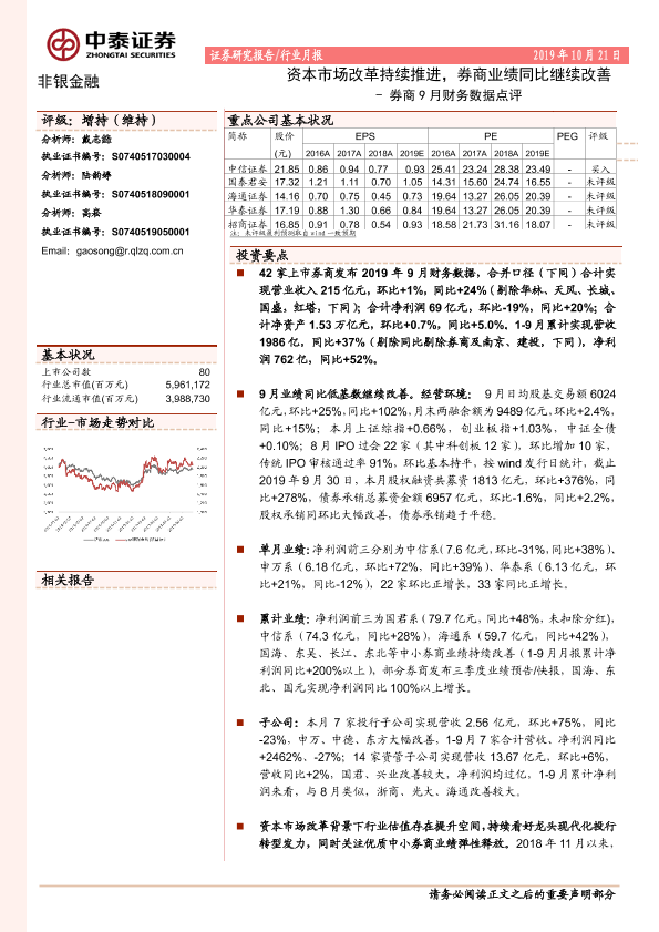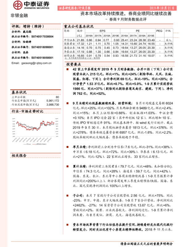 【中泰证券】【20191021】券商9月财务数据点评:资本市场改革持续推进,券商业绩同比继续改善-12页