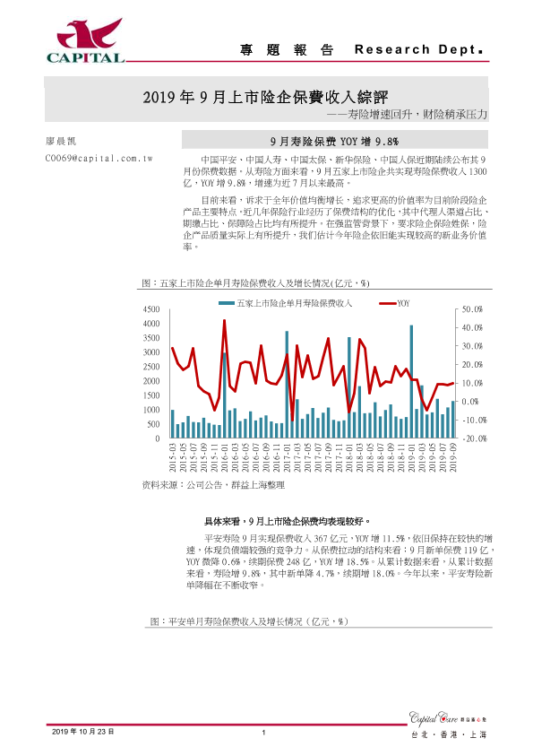 【群益证券】【20191023】2019年9月上市险企保费收入综评-8页