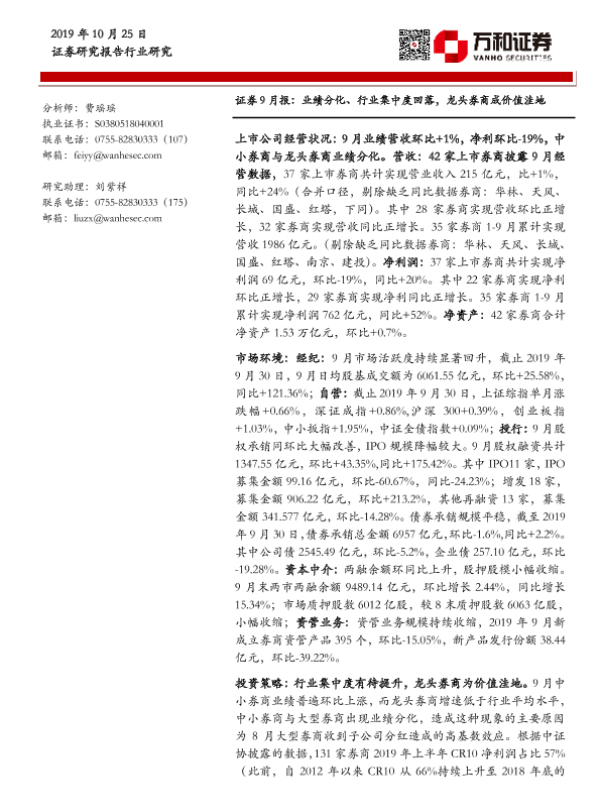 【万和证券】【20191025】证券9月报:业绩分化、行业集中度回落,龙头券商成价值洼地-16页