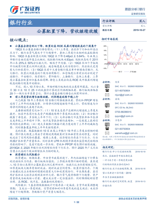 【广发证券】【20191027】银行行业跟踪分析:公募配置下降,营收继续放缓-22页