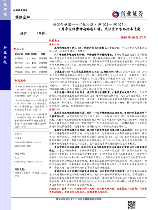 【兴业证券】【20191027】9月寿险保费增速略有好转,关注资本市场改革进度-10页