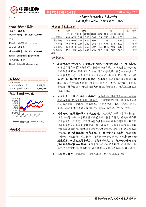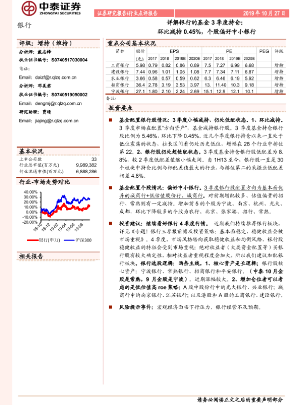 【中泰证券】【20191027】详解银行的基金3季度持仓:环比减持0.45%,个股偏好中小银行-9页