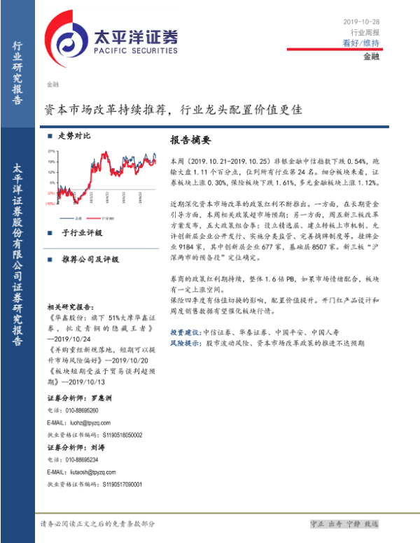 【太平洋证券】【20191028】金融行业周报:资本市场改革持续推荐,行业龙头配置价值更佳-13页