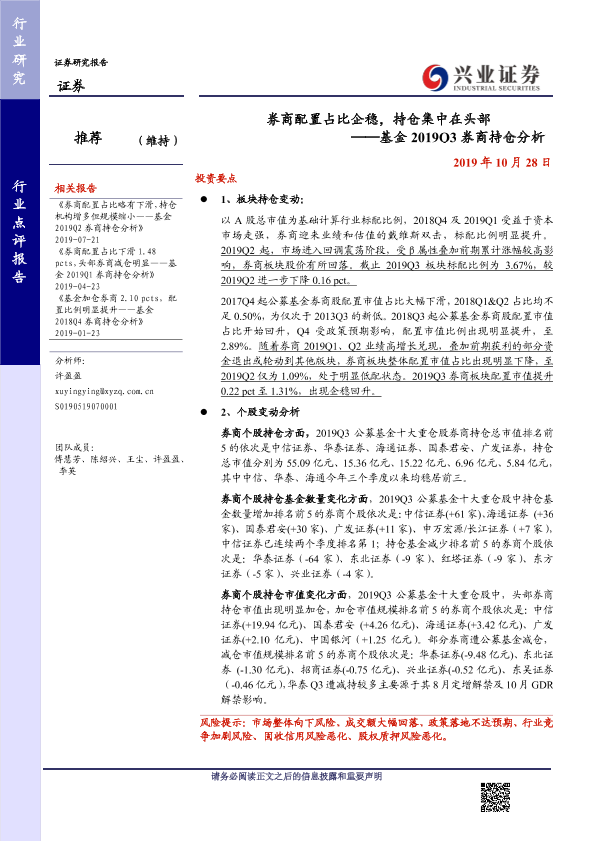 【兴业证券】【20191028】基金2019Q3券商持仓分析:券商配置占比企稳,持仓集中在头部-6页