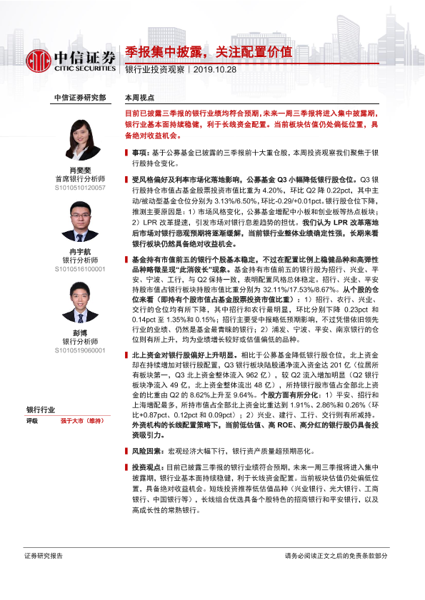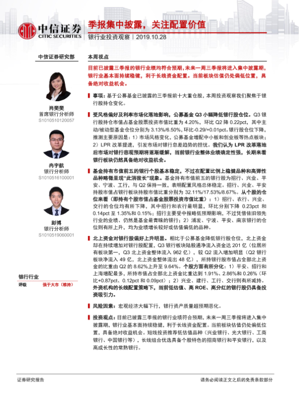 【中信证券】【20191028】银行业投资观察:季报集中披露,关注配置价值-10页