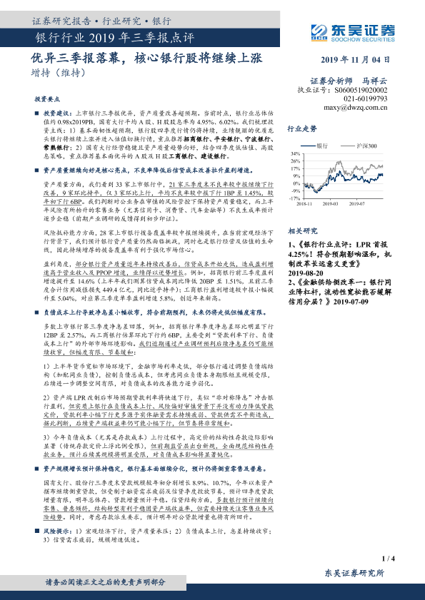【东吴证券】【20191104】银行行业2019年三季报点评:优异三季报落幕,核心银行股将继续上涨-4页