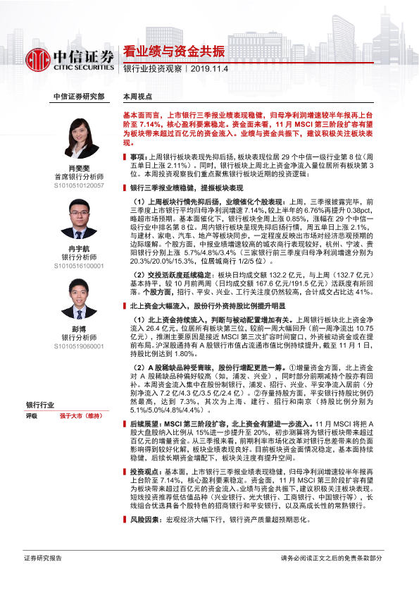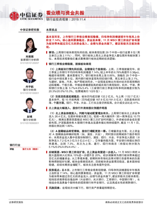 【中信证券】【20191104】银行业投资观察:看业绩与资金共振-11页