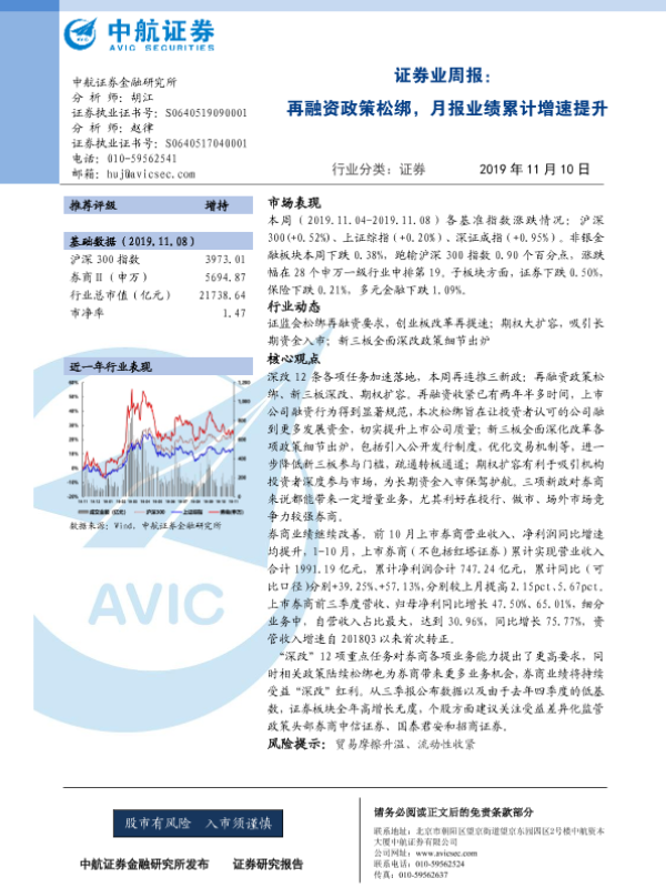 【中航证券】【20191110】证券业周报:再融资政策松绑,月报业绩累计增速提升-11页