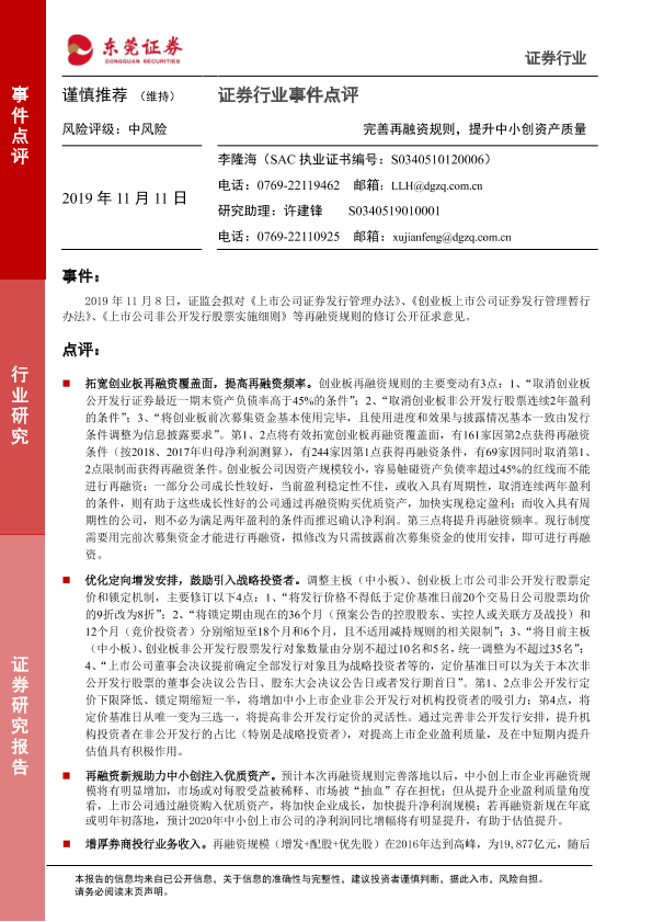 【东莞证券】【20191111】证券行业事件点评:完善再融资规则,提升中小创资产质量-3页