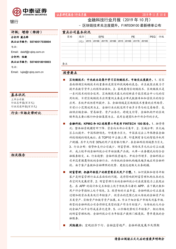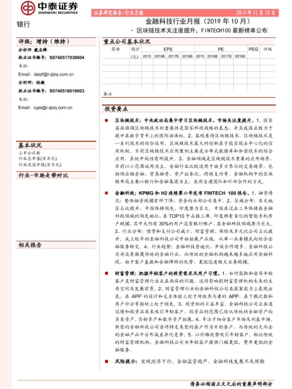 【中泰证券】【20191110】金融科技行业月报:区块链技术关注度提升,FINTECH100最新榜单公布-16页