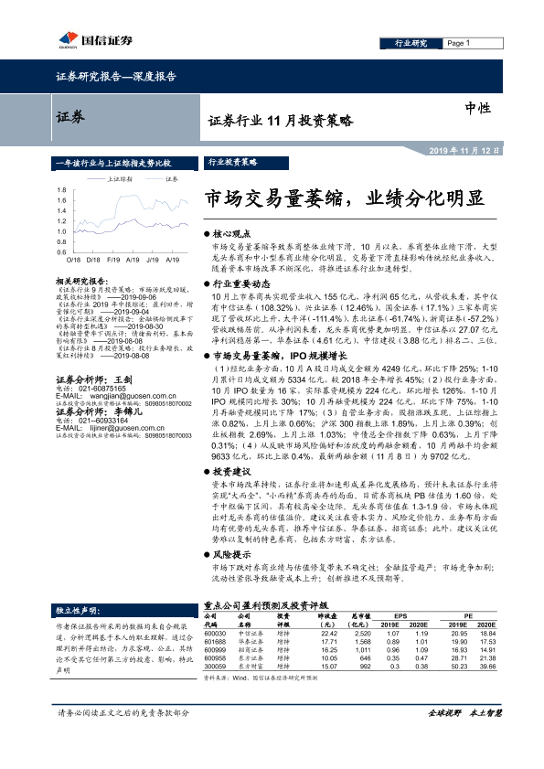 【国信证券】【20191112】证券行业11月投资策略:市场交易量萎缩,业绩分化明显-8页