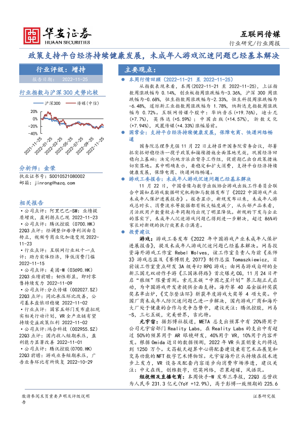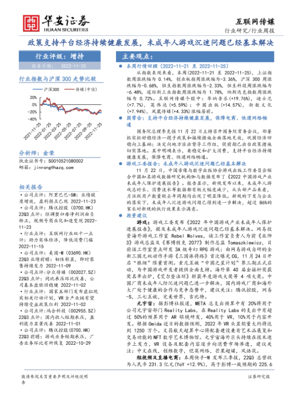 【华安证券】【20221125】互联网传媒行业周报:政策支持平台经济持续健康发展,未成年人游戏沉迷问题已经基本解决-27页