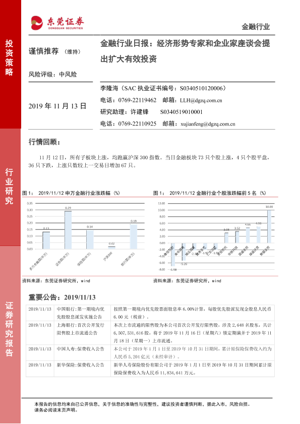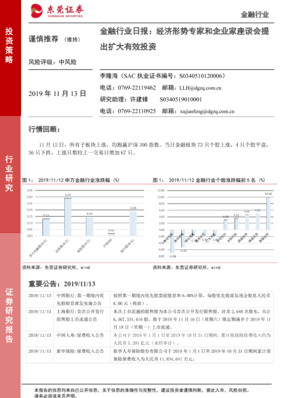 【东莞证券】【20191113】金融行业日报:经济形势专家和企业家座谈会提出扩大有效投资-4页