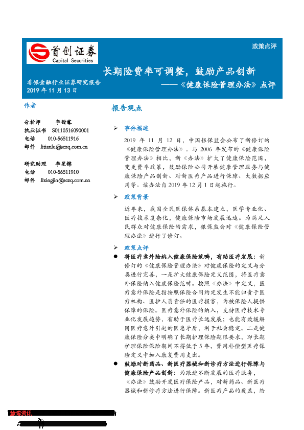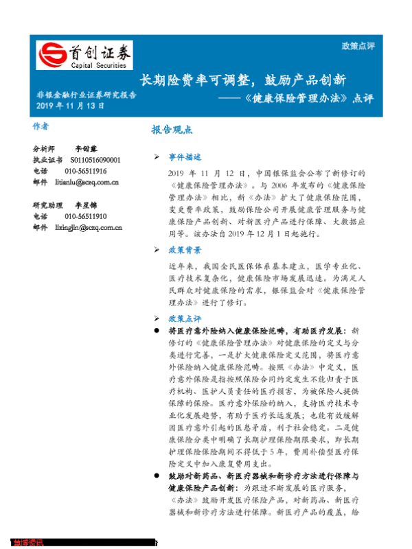 【首创证券】【20191113】非银金融行业《健康保险管理办法》点评:长期险费率可调整,鼓励产品创新-5页