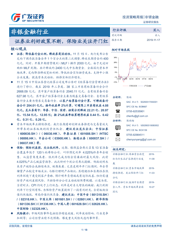 【广发证券】【20191117】非银金融行业投资策略周报:证券业利好政策不断,保险业关注开门红-13页