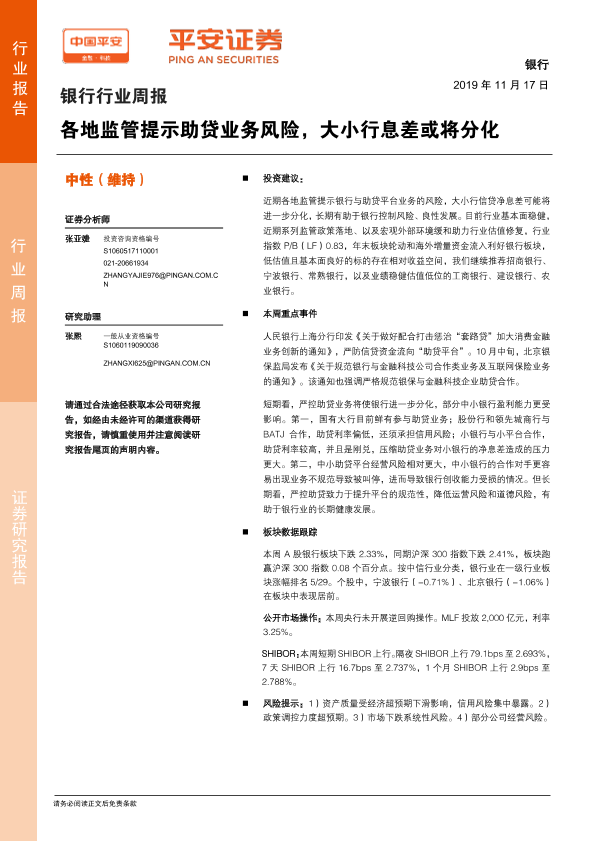 【平安证券】【20191117】银行行业周报:各地监管提示助贷业务风险,大小行息差或将分化-5页