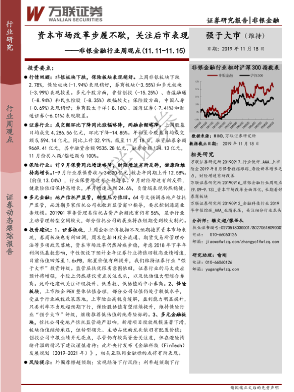 【万联证券】【20191118】非银金融行业周观点:资本市场改革步履不歇,关注后市表现-10页