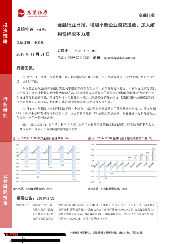 【东莞证券】【20191121】金融行业日报:增加小微企业信贷投放,加大结构性降成本力度-4页