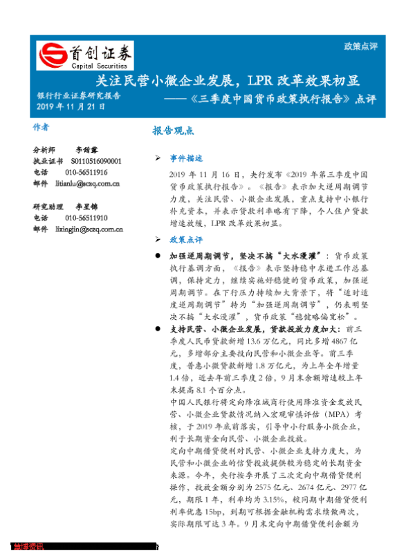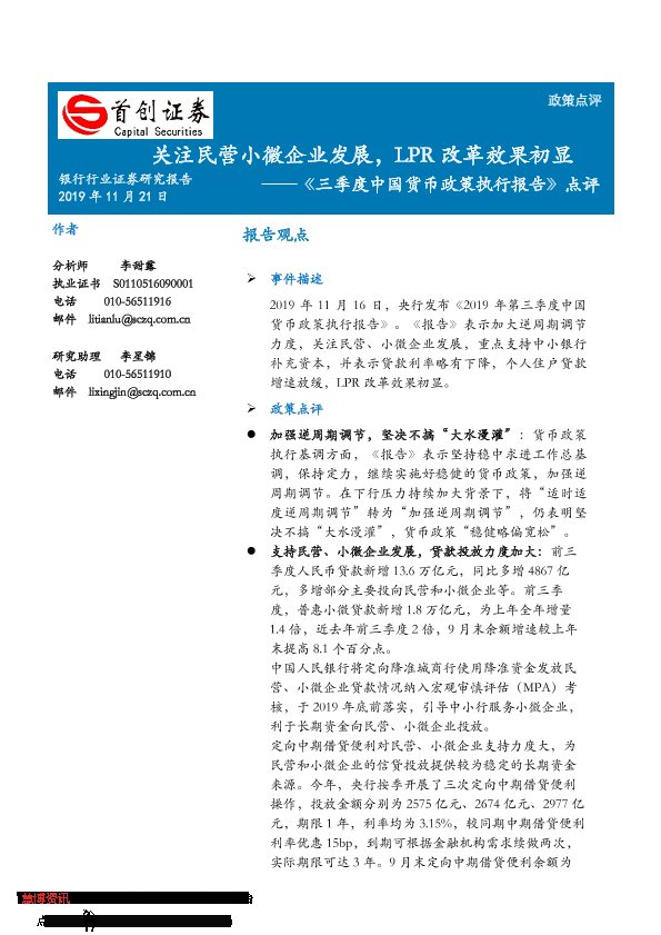 【首创证券】【20191121】三季度中国货币政策执行报告点评-4页
