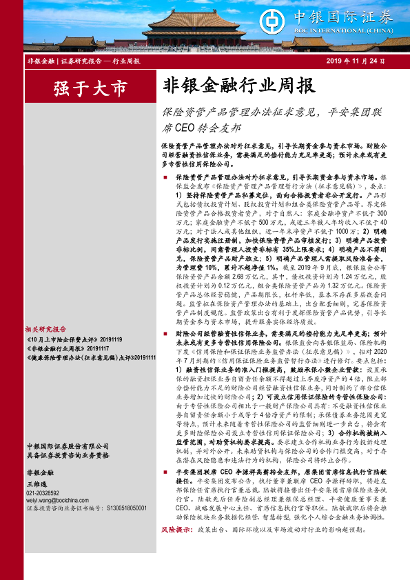 【中银证券】【20191124】非银金融行业周报:保险资管产品管理办法征求意见,平安集团联席CEO转会友邦-13页