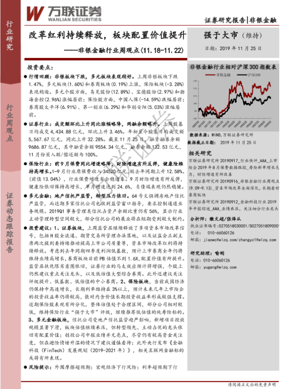 【万联证券】【20191125】非银金融行业周观点:改革红利持续释放,板块配置价值提升-9页