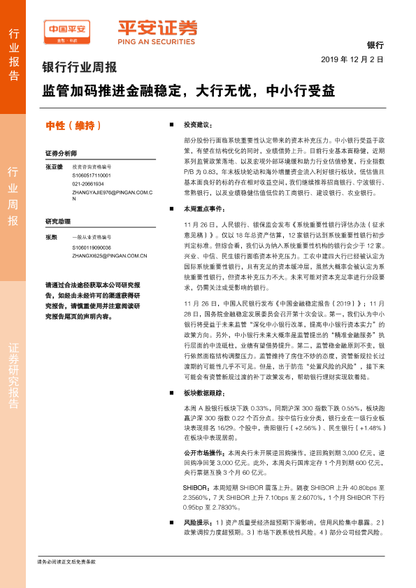 【平安证券】【20191202】银行行业周报:监管加码推进金融稳定,大行无忧,中小行受益-8页