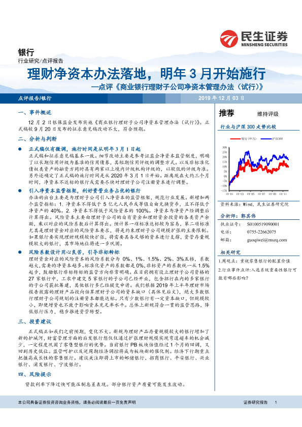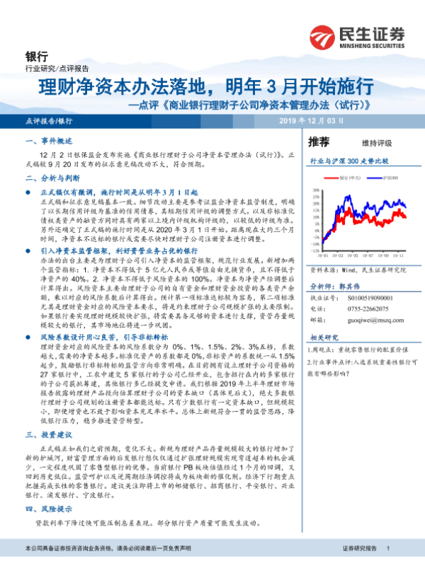 【民生证券】【20191203】点评《商业银行理财子公司净资本管理办法(试行)》:理财净资本办法落地,明年3月开始施行-7页
