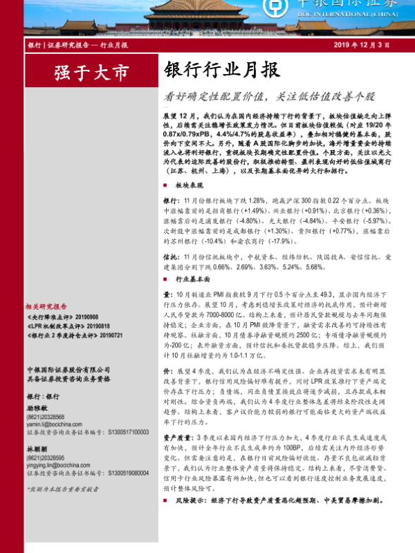 【中银证券】【20191203】银行行业月报:看好确定性配置价值,关注低估值改善个股-18页